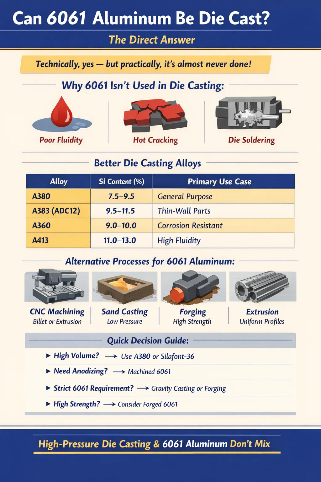 実際的なポイントは、ダイカストが特に HPDC を意味する場合 (ほとんどの業界の会話ではそう呼ばれます)、6061 は避けるべきであるということです。低圧または重力プロセスが範囲内にある場合、特に T6 熱処理が必要な構造部品の場合、6061 が実行可能な選択肢になります。