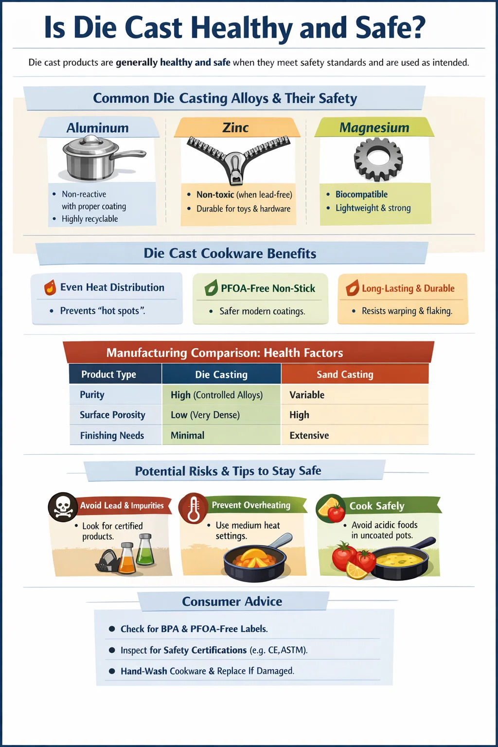 一般的に、このような方法で作られた製品は、 ダイカスト 国際安全基準を満たし、意図どおりに使用されている限り、日常使用には健康的で安全であると考えられます。ダイカスト製品の「健全性」は主に、使用される卑金属 (アルミニウム、亜鉛、マグネシウムなど) とそれに適用される表面処理によって決まります。調理器具の場合、適切にコーティングされていれば反応しないため、ダイカストアルミニウムが非常に人気がありますが、玩具やハードウェアでは、耐久性があり、鉛などの有毒な添加物が含まれていないため、亜鉛ダイカストが好まれています。
