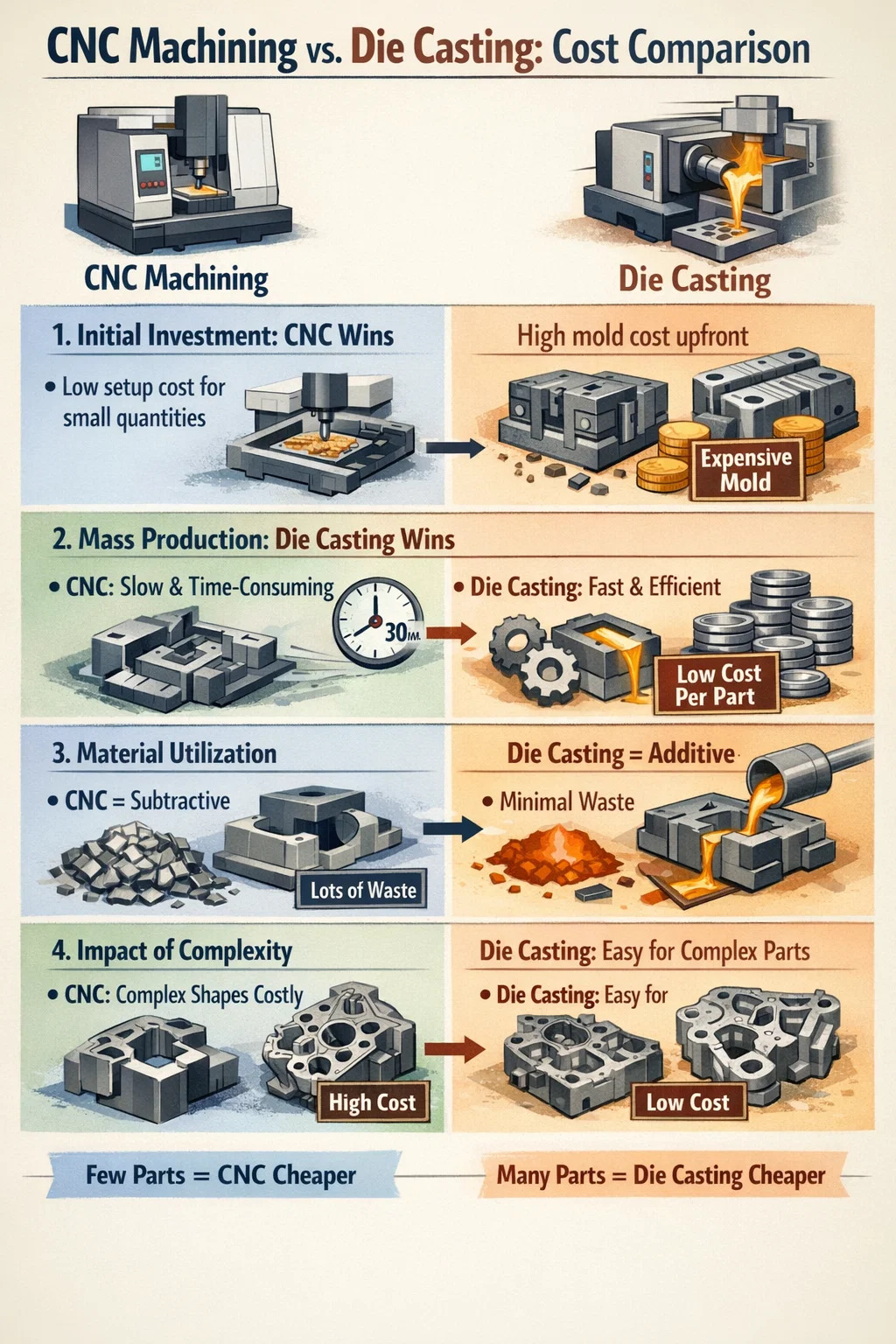 スピードがコストを決定します。ダイカストでは数秒で部品を「製造」できますが、CNC では細心の注意を払って 30 分かかる場合があります。時は金なり、大規模生産ではダイカストの効率により単価を非常に低いレベルまで下げることができます。
