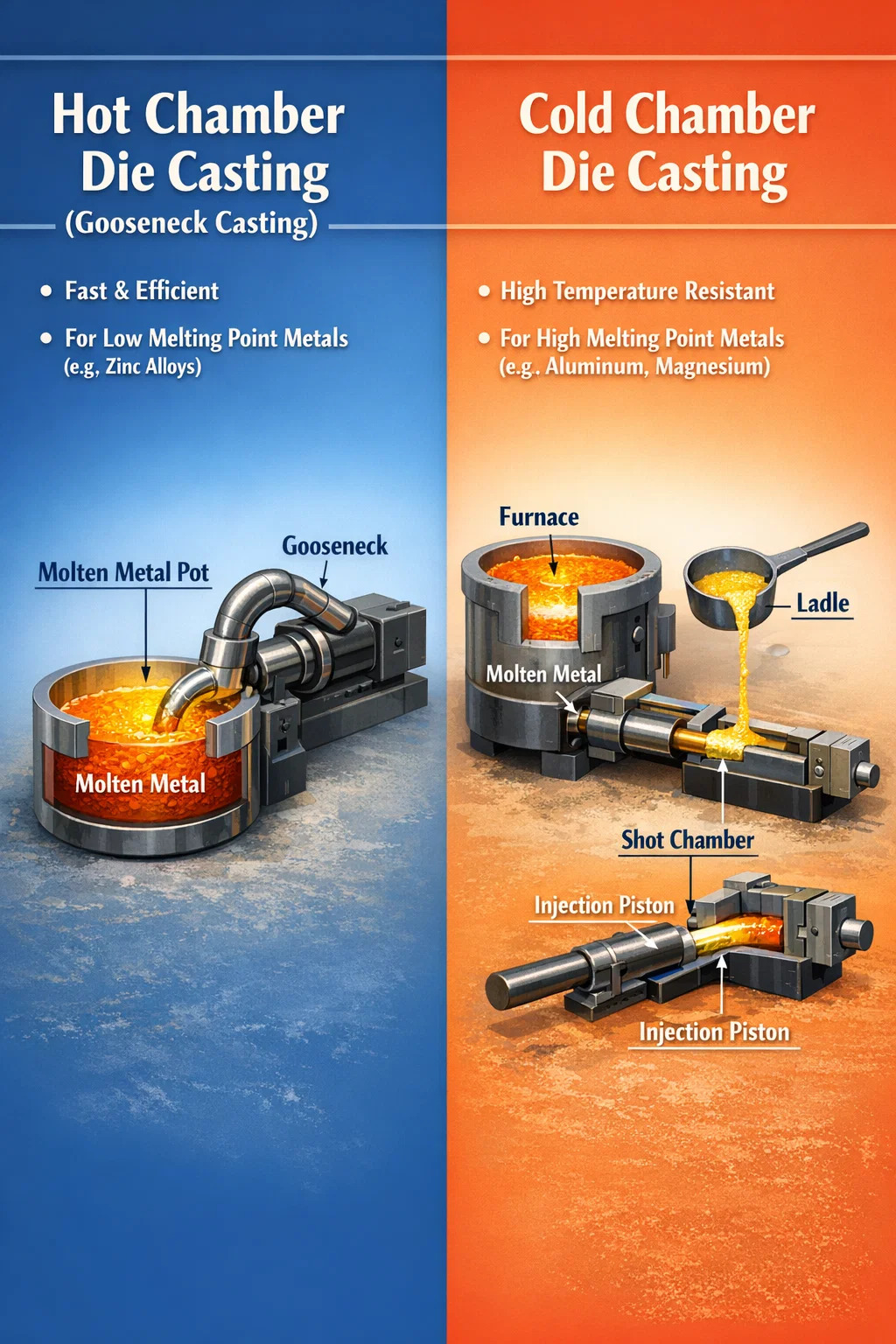 の世界で ダイカスト 、金属を溶かして金型に注入する方法に基づいて、ホット チャンバー ダイカストとコールド チャンバー ダイカストという 2 つの主なカテゴリがあります。