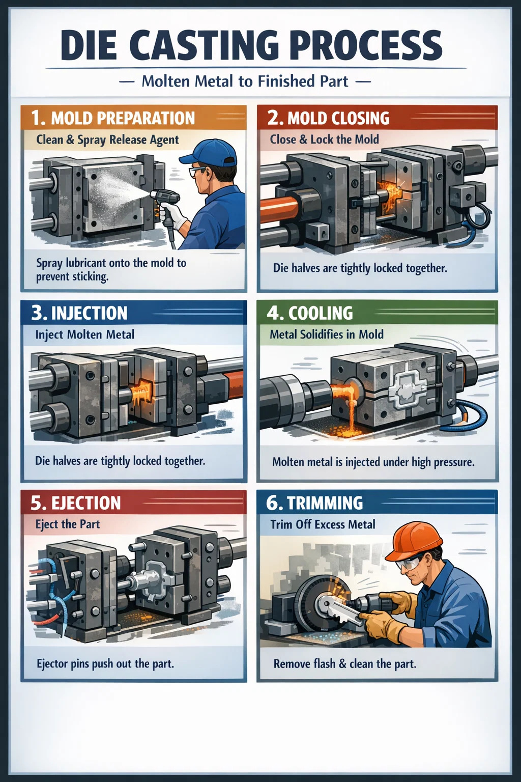 重要なポイント: この時点で、機械は金型をロックするために非常に大きな力を加えます。圧力が非常に高いため、金型がしっかりと固定されていないと、隙間から溶けた金属が飛び散り、部品が破損してしまいます。