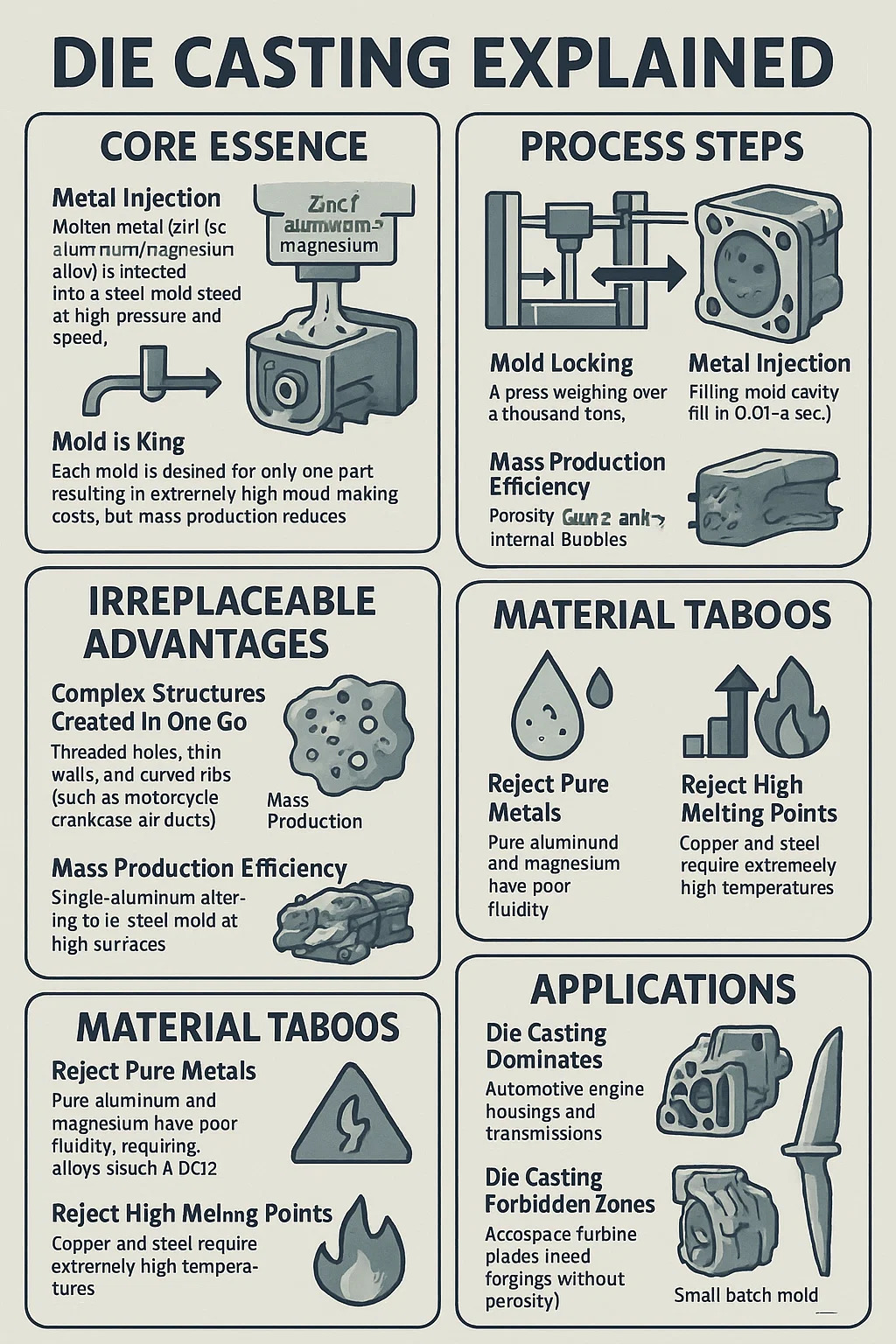 金属射出成形:溶融金属(亜鉛/アルミニウム/マグネシウム合金)を高圧と速度で鋼型に注入し、冷却後に排出して部品を形成します。